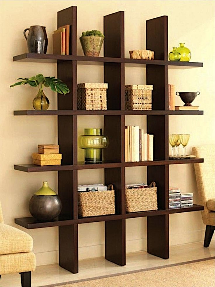 - Стеллаж ступенчатый – секции, полки. Для многочисленных книг это самый лучший вариант, так же как и для посуды, для декора. Используется для зонирования помещения.